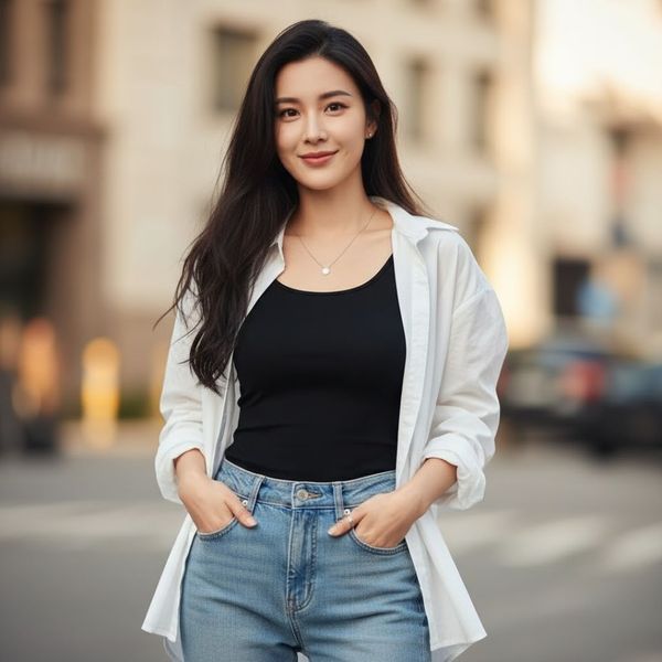 Phối hợp: Áo Sơ Mi Trắng Oversized (tháo cúc) + Áo Hai Dây/Áo Ba Lỗ Đen (Fitted) + Quần Jeans Cạp Cao.