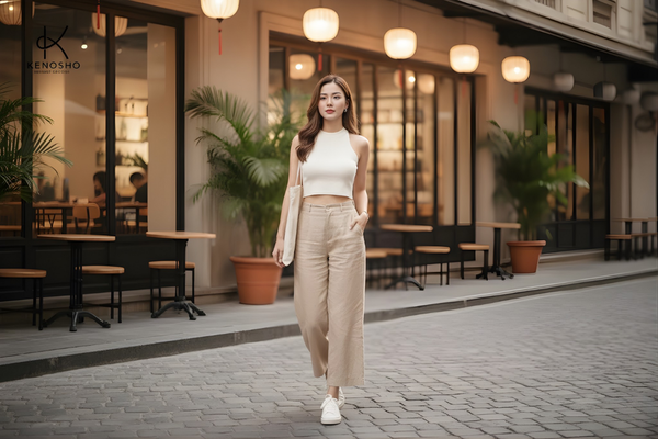 Khi kết hợp với croptop, phần eo trở nên nổi bật và tổng thể rất thanh lịch, phù hợp tiệc nhẹ hoặc hẹn hò.
