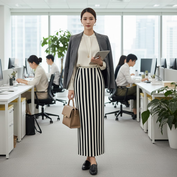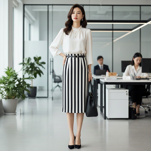 Đường Kẻ Sọc Dọc (Vertical Stripes): Nếu chọn chân váy suông có họa tiết, hãy ưu tiên các đường kẻ sọc dọc. Chúng tạo ảo giác kéo dài cơ thể, giúp bạn trông cao và mảnh mai hơn.