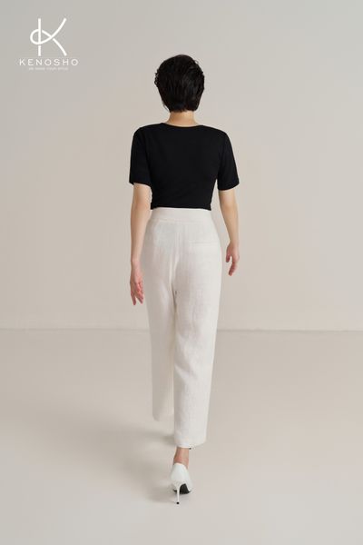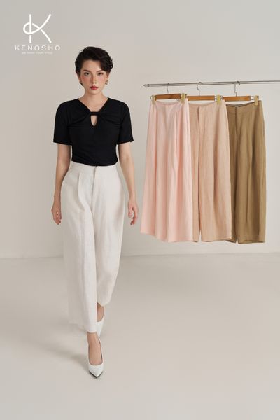 Lý do: Vải đứng dáng giúp quần chảy thẳng xuống, tránh bám vào đường cong cơ thể, giúp tổng thể trông gọn gàng, thanh thoát và cao ráo hơn. Tránh Linen quá mỏng, dễ bị bay hoặc quá nhàu.